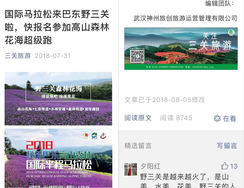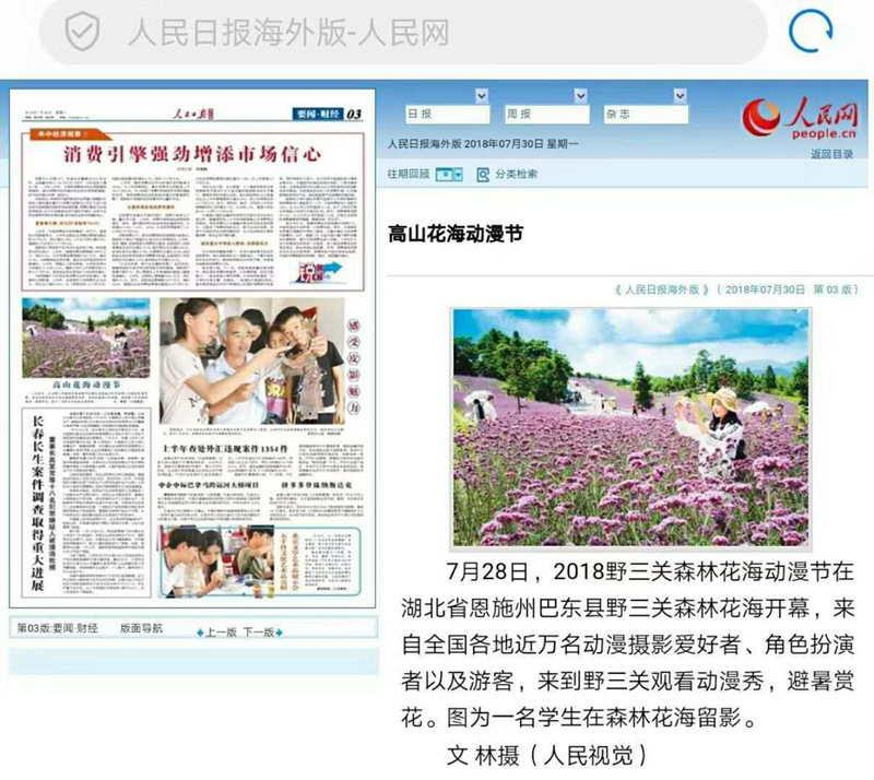 2018年7月28日至29日,由武汉神州旅创文旅集团旗下运营管理公司策划执行,邀请湖北知音传媒集团联合执行的“2018森林花海动漫节暨知音文旅楚天行(巴东)活动”在野三关森林花海展开。2018.7.28,神州旅创承办野三关森林花海动漫节,被《人民日报》报道。